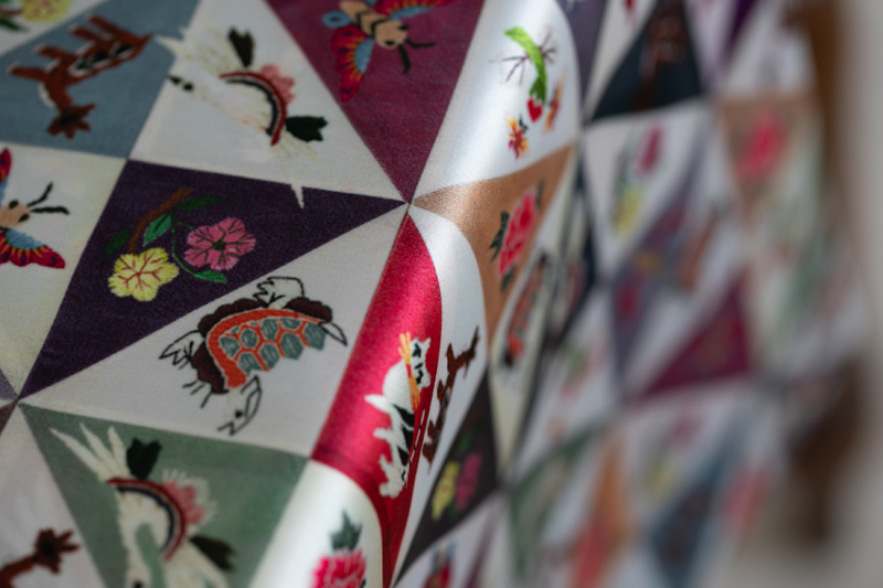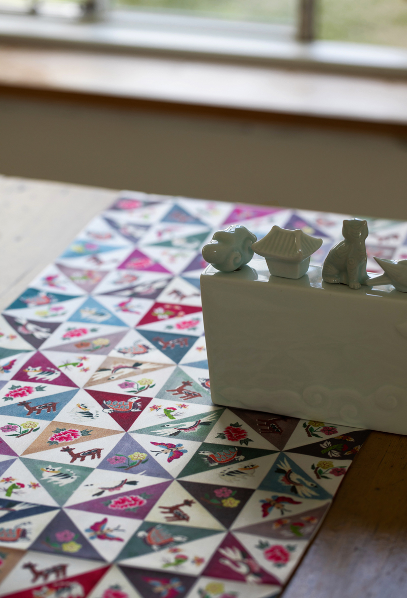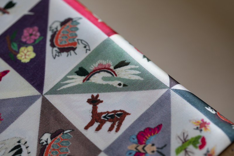 실크소재는 아니지만 원본 조각보의 컬러감과디자인이 고급스러워서, 프린트한 공단의 컬러감과 퀄러티가 아주 좋습니다.