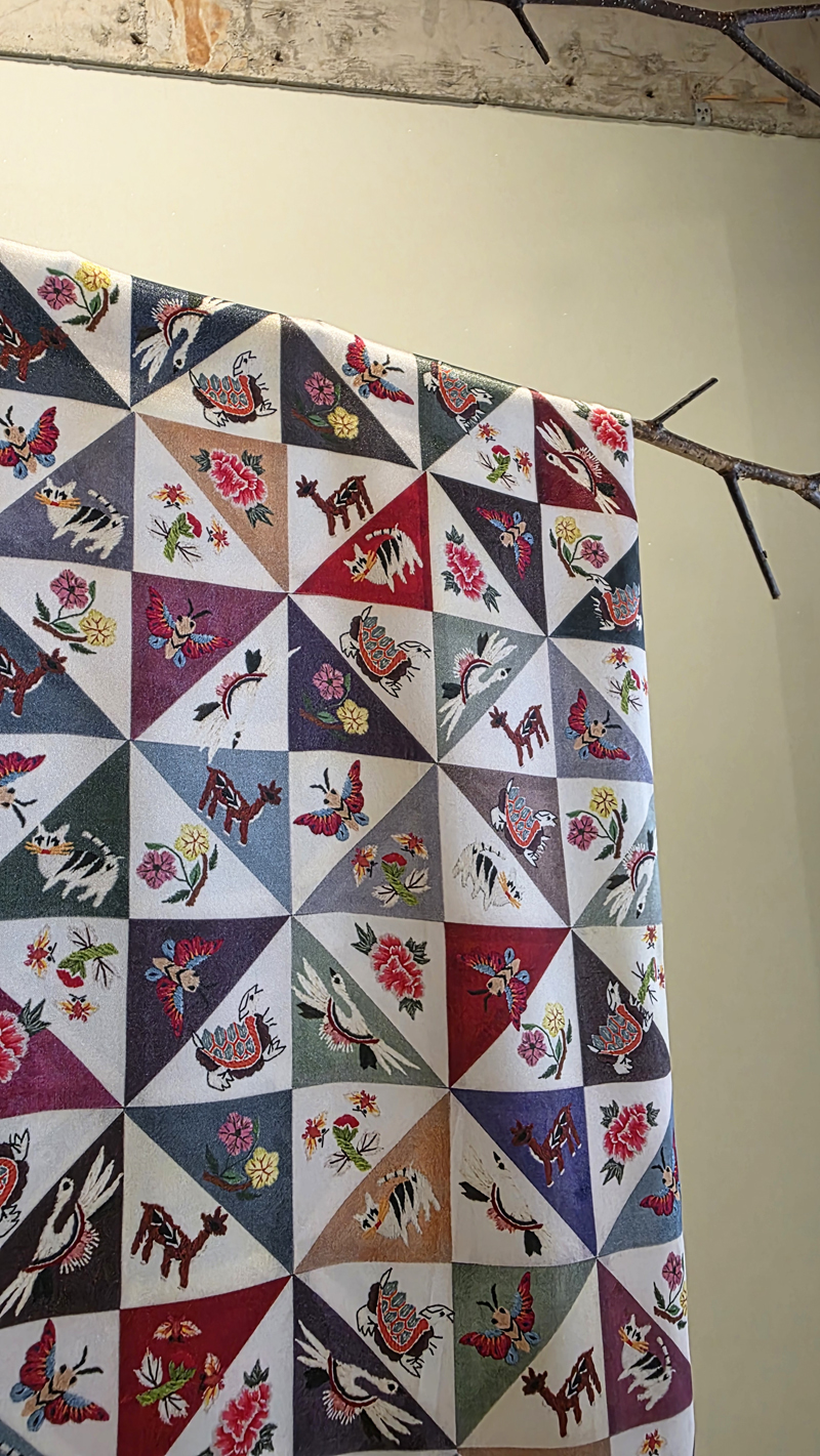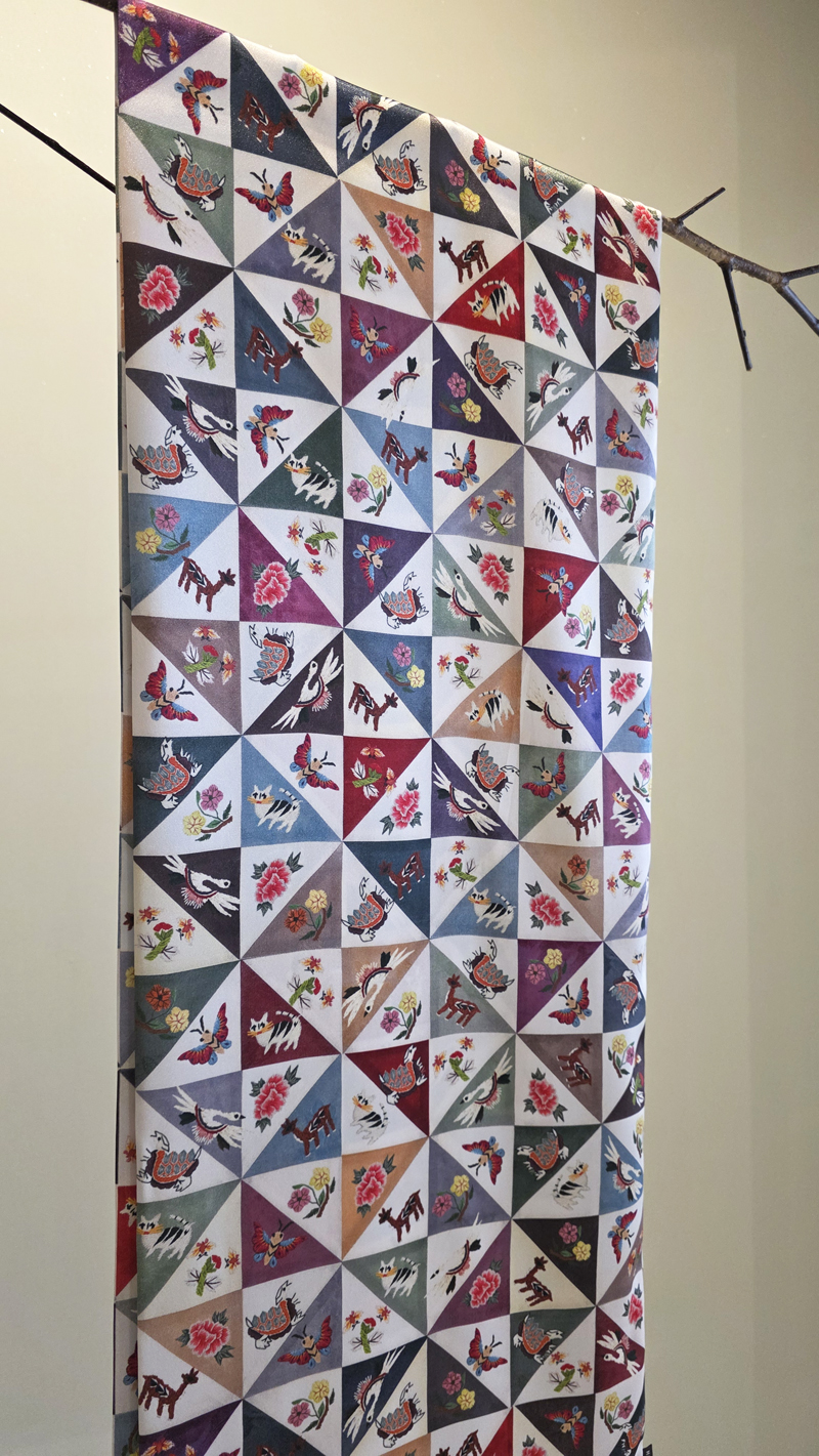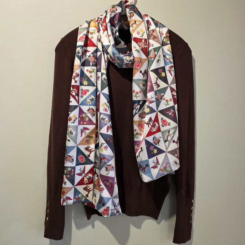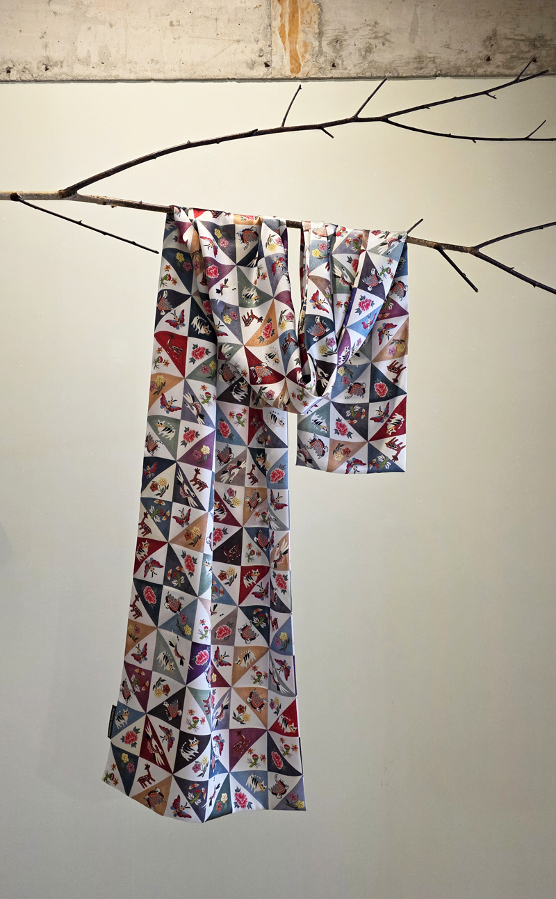 톤다운 된 색상의 국화명주를 사선으로 이어서조각보를 만든 다음, 자수실의 질감이 살아나도록길상문양과 십장생문양을 그린 다음부드러운 실크 느낌의 샤무즈공단에<프린트>해서 만든 스카프입니다.