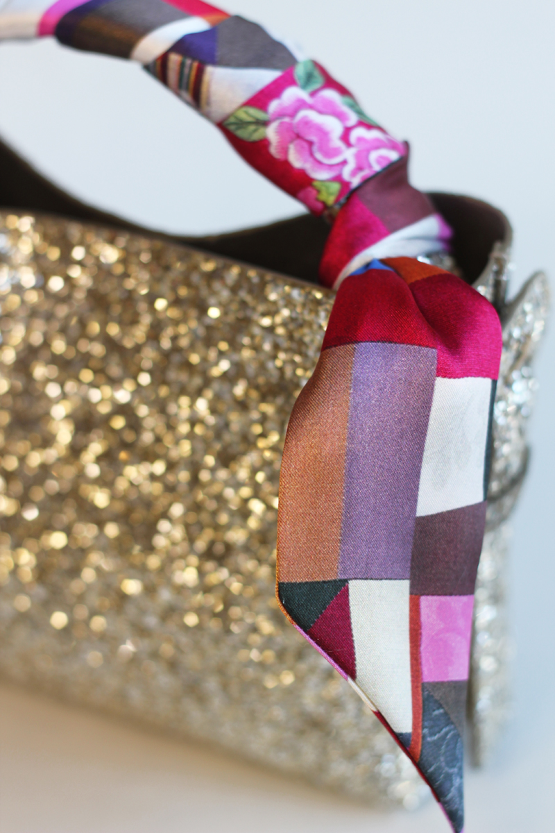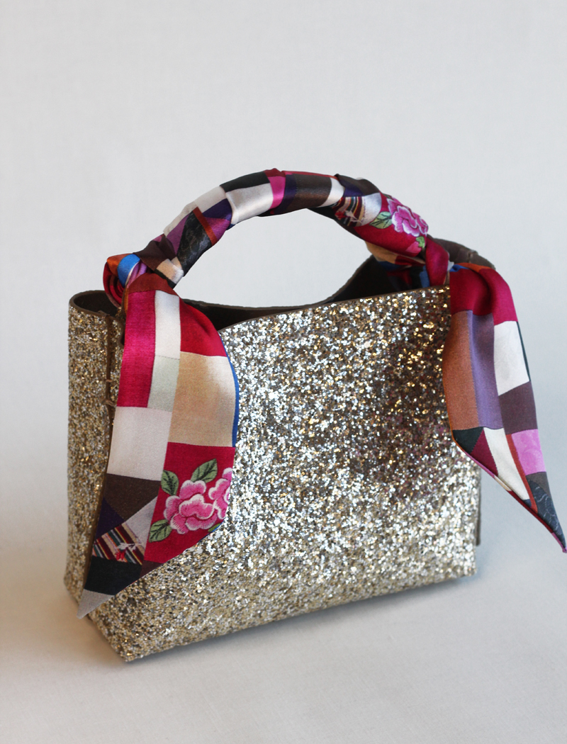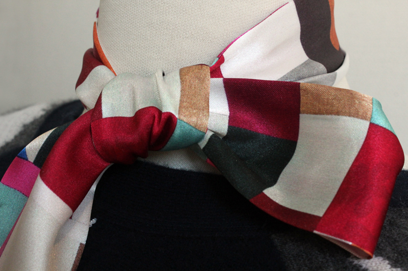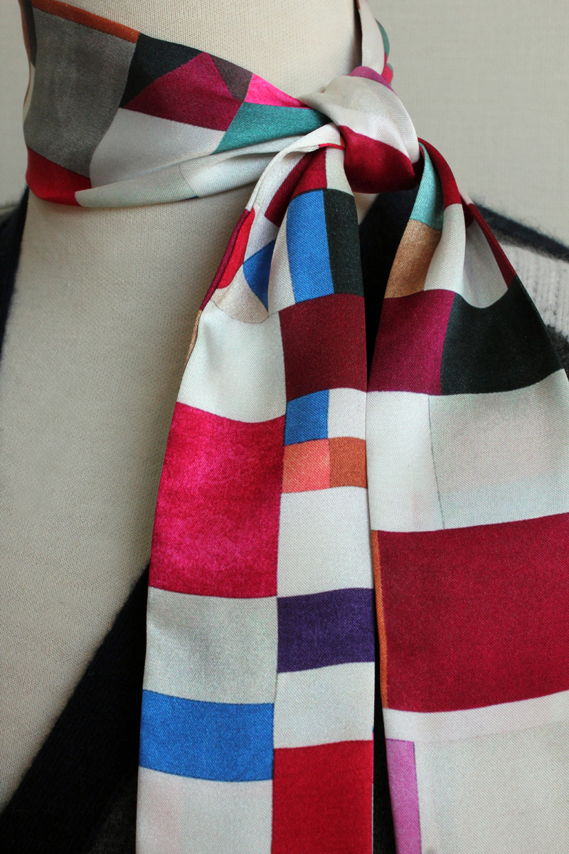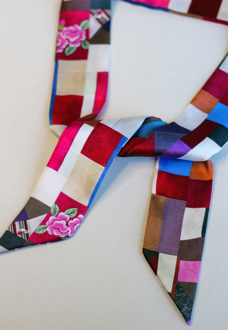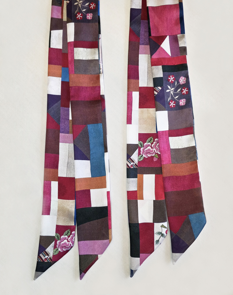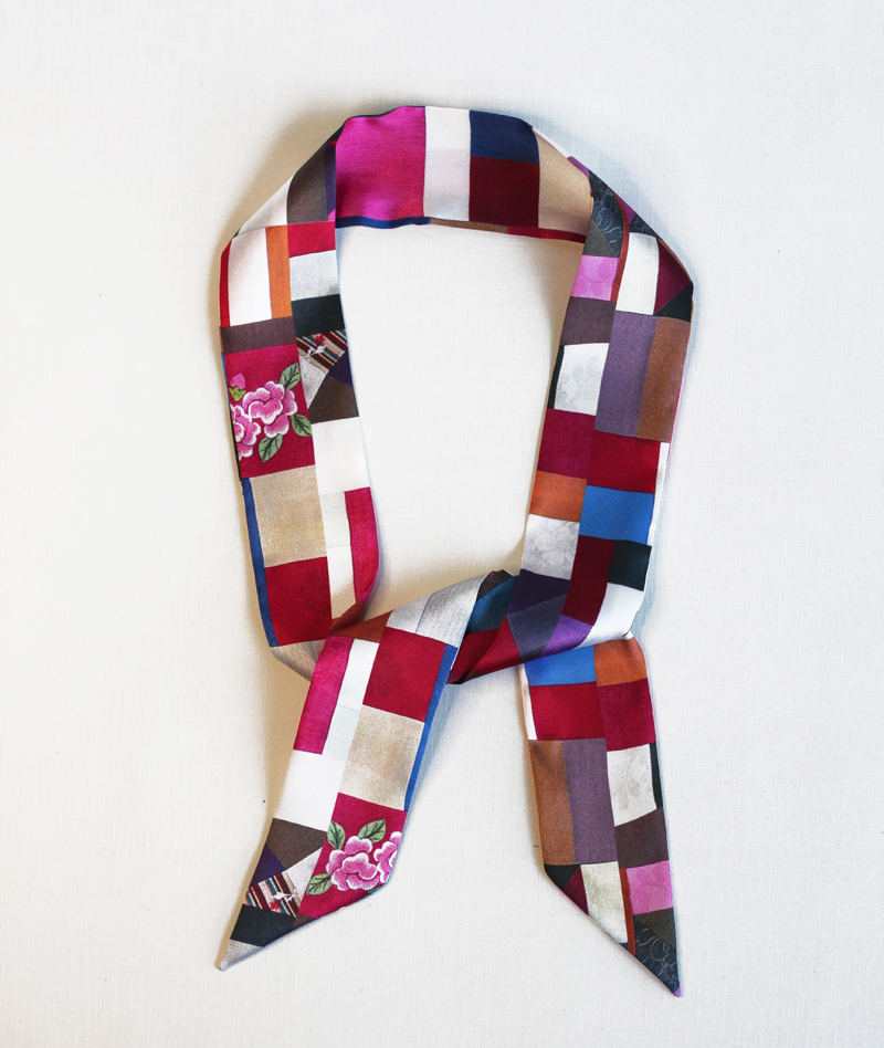 직접 조각보를 만들어서 프린트 한, 한지희클래식의 시그니처 원단으로제작한 트윌리입니다. 원단은 부드러운 실크느낌의 샤무즈공단입니다.