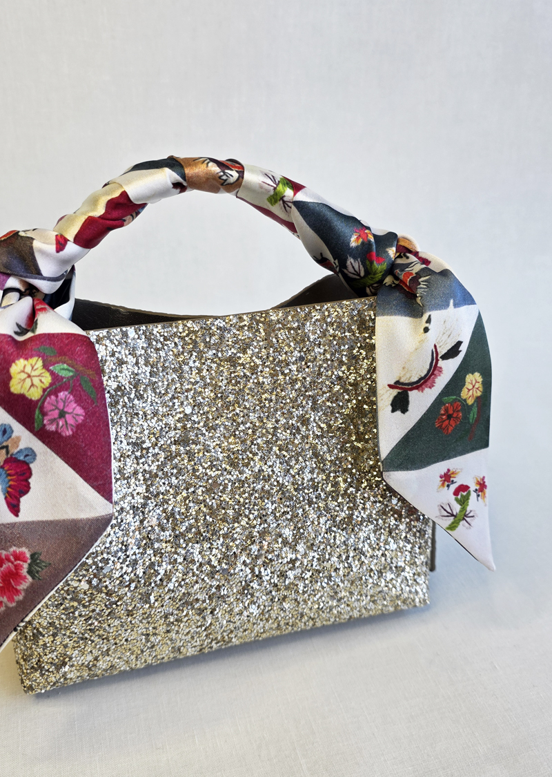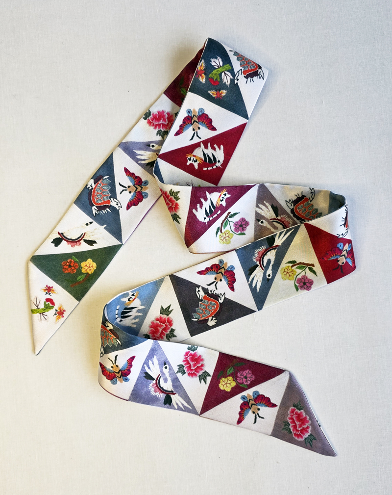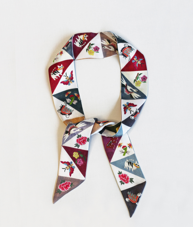 조각보를 만들어서 프린트 한, 한지희클래식의 시그니처 원단으로제작한 트윌리입니다. 원단은 부드러운 실크느낌의 샤무즈공단입니다.
